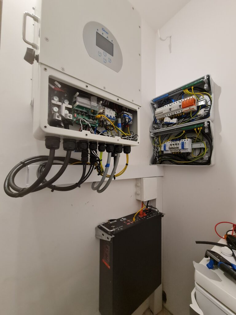 Instalacja hybrydowa składająca się z falownika hybrydowego 10kw, instalacji PV 10kw oraz magazynu ebergii 5kWh. Instalacja została wyposażona w przełącznik zapewniający możliwość przepięcia magazynu równolegle lub szeregowo co w przypadku podjęcia decyzji o rozszerzeniu pojemności magazynu da możliwość działania w trybie zasilania awaryjnego całego domu.