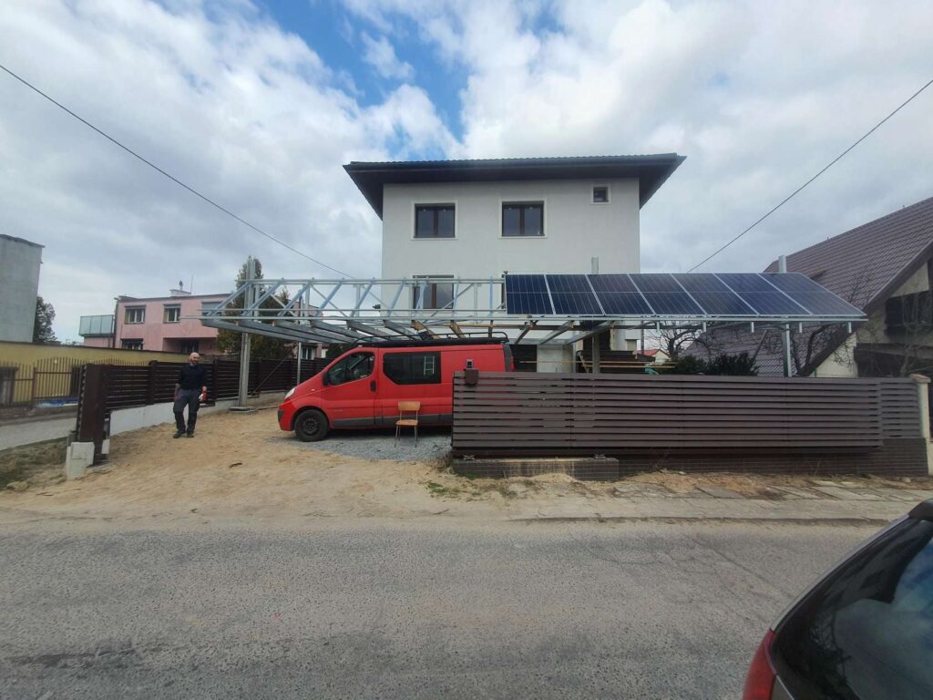 Instalacja fotowoltaiczna o mocy 7 kW zamontowana na konstrukcji wiaty samochodowej